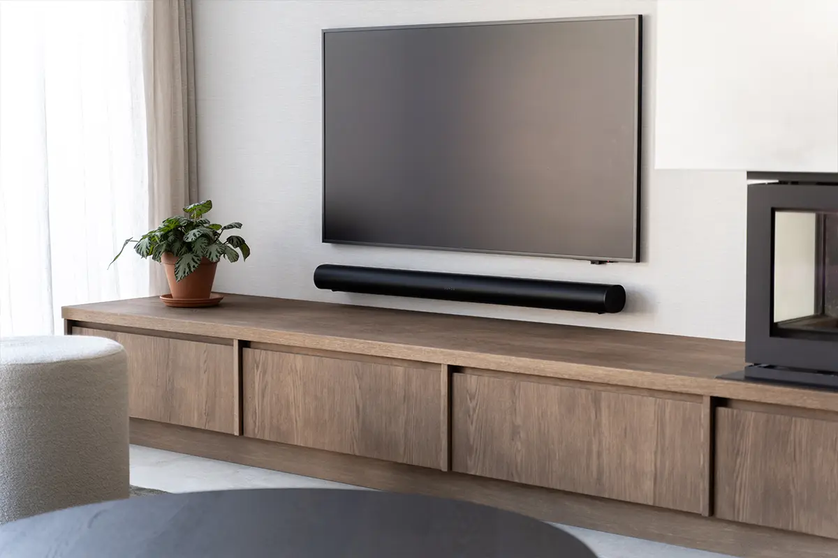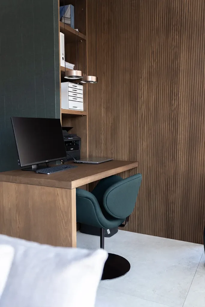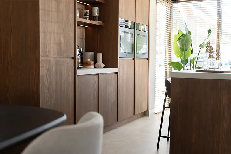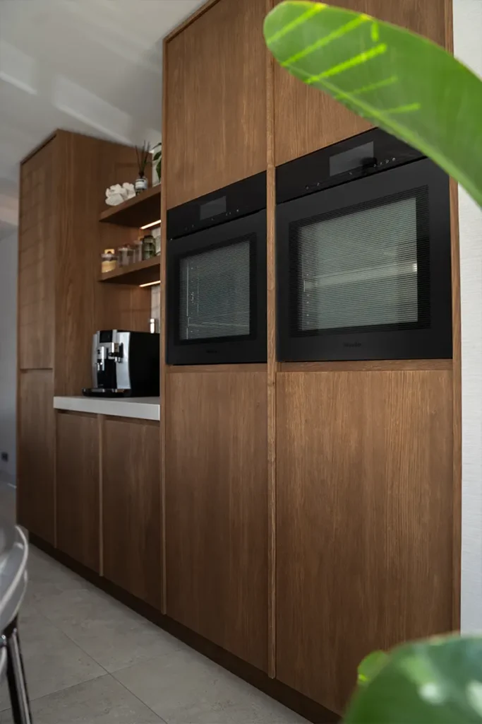 Het resultaat is een prachtig voorbeeld van Japandi-design. We hebben gekozen voor een kastenwand van licht eikenhout met een verticale lattenstructuur, wat zorgt voor een subtiel lijnenspel en een warme textuur. Het kookeiland, uitgevoerd in een zachte zandkleurige kalksteen-look, loopt naadloos over in de vloer, waardoor de ruimte optisch groter lijkt.